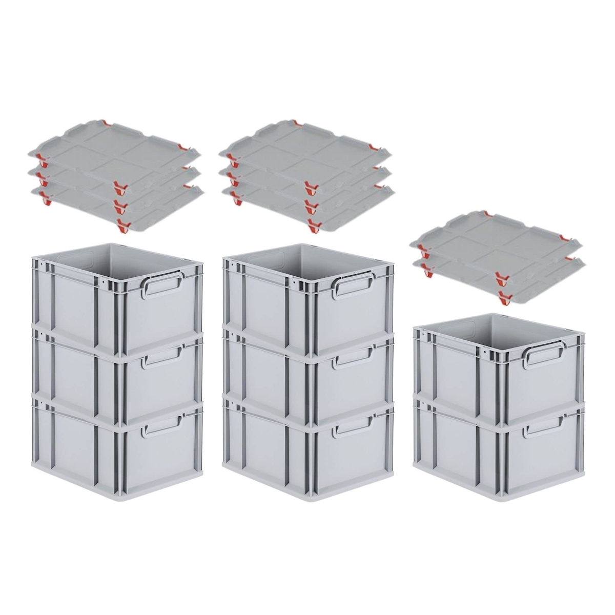 PROREGAL SuperSparSet 8x Eurobox NextGen Economy mit Auflagedeckel & 4x Verschlüsse Rot, Griffe zu, HxBxT 22x30x40cm, 20L, Eurobehälter, Box