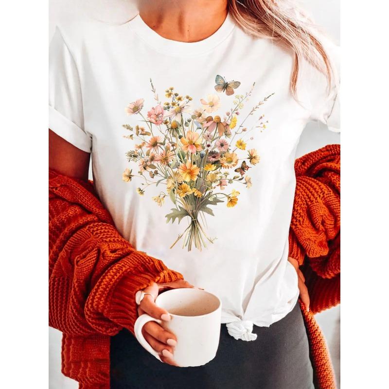 European sizes Summer Flower Print T-shirt, Short Sleeve Crew Neck Casual Top for Summer & Spring, Women's Clothing cm