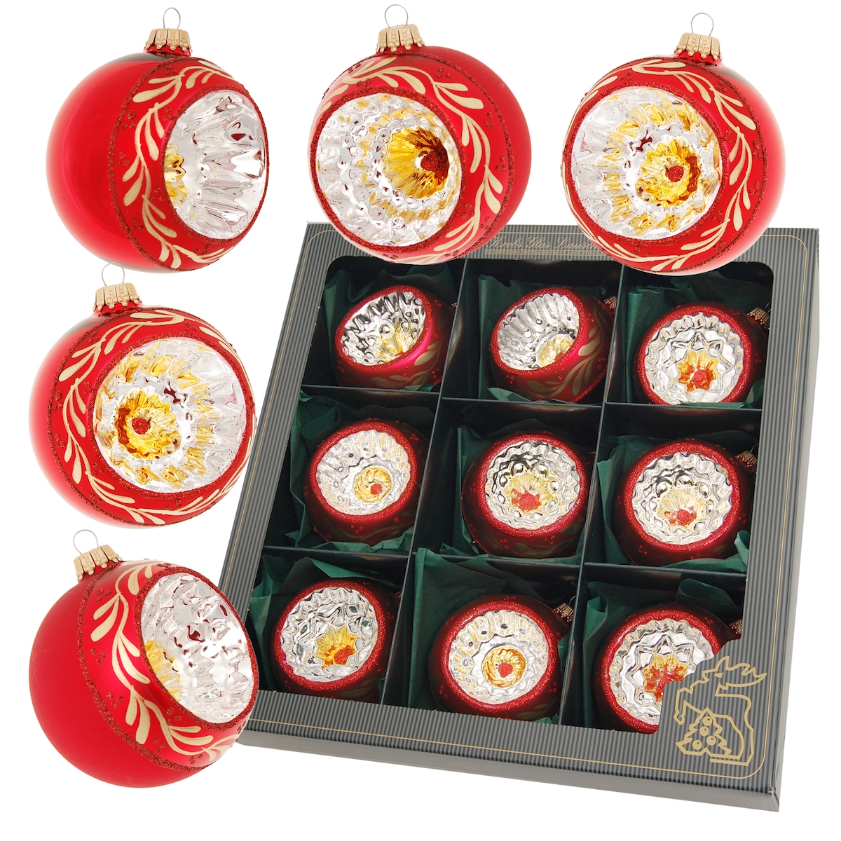 Krebs Glas Lauscha Riffelkugeln mit Glitter & Sternen, Rot & Gold Satin, 8cm