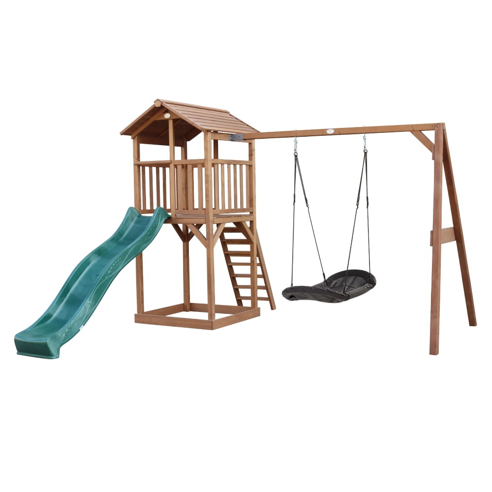 Parco giochi con arrampicata, scivolo verde, altalena, legno, marrone