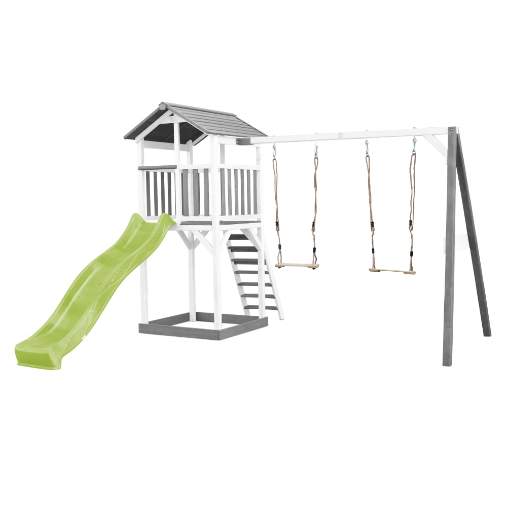 Parco giochi con arrampicata, scivolo verde, altalena, bianco/grigio