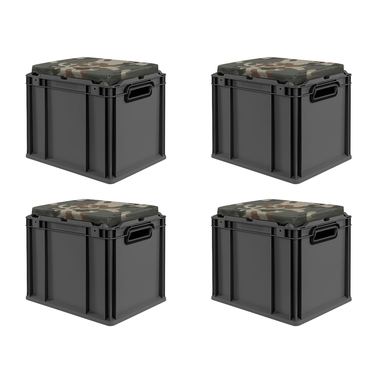 PROREGAL SparSet 4x Eurobox NextGen Seat Box Camouflage, HxBxT 36,5x30x40cm, 30 Liter, Griffe offen, Schwarz, Eurobehälter, Sitzbox, Transportbox