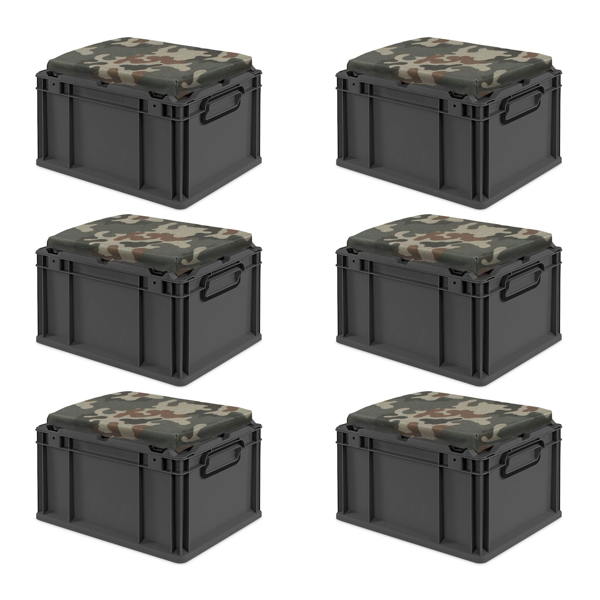 PROREGAL SparSet 6x Eurobox NextGen Seat Box Camouflage, HxBxT 26,5x30x40cm, 20 Liter, Griffe geschlossen, Schwarz, Eurobehälter, Sitzbox