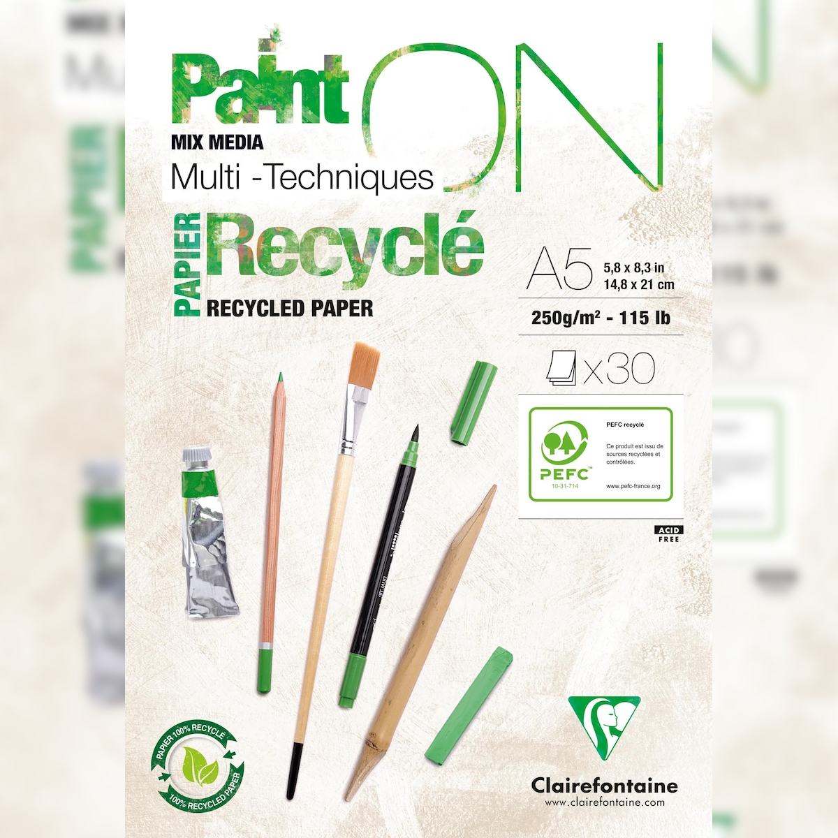 Clairefontaine 4x PaintON Recycling, Block A5, kopfseitig geleimt, 30 Blatt, 250g, weiß, Mixed Media - 975740C