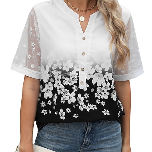 Per donna Top estivi Blusa Top Eleganti Floreale Grafico Semplice Elegante Vintage Quotidiano Manica Corta Scollo a V Top Regolari Quotidiano Lavoro Ferie Arricciato Pizzo Patchwork Blu Verde