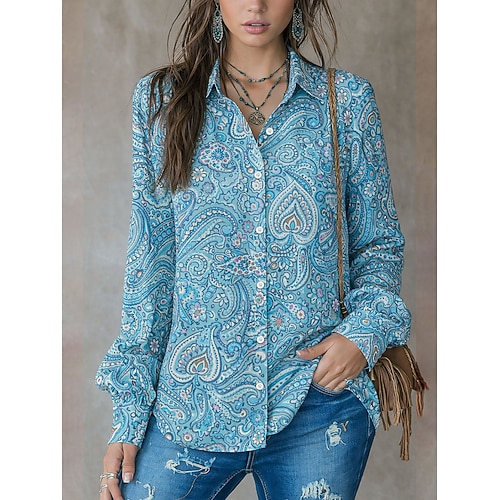 Per donna Camicia Bottoni Stampato Grafico Paisley Vintage Elegante Moderno Manica Lunga Colletto a Camicia Top Regolari Quotidiano Blu Rosa Rosso Arancione Estate Primavera