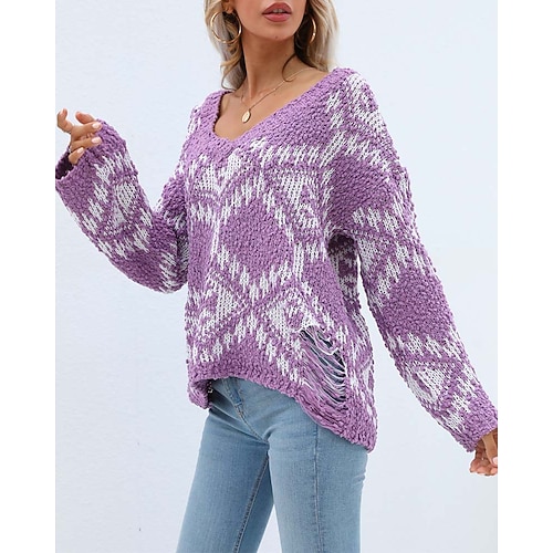 Per donna Felpa Giornaliero Informale Fantasia geometrica Stampa Girocollo Lavorato a maglia Testurizzato Manica lunga Maglie lunghe Maglia Esterno Ufficio Bianco Viola Autunno Inverno