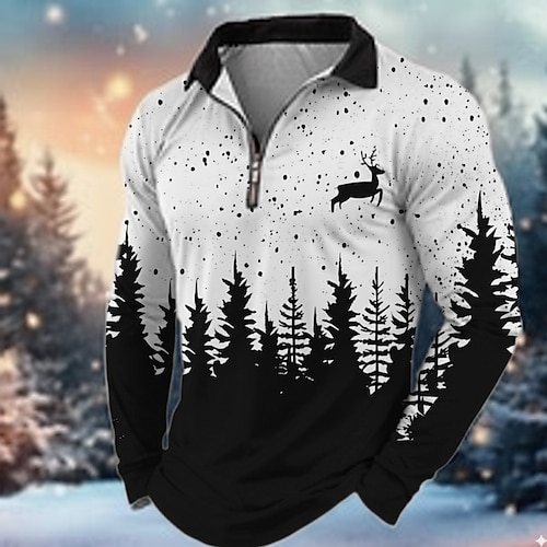 Natale Per uomo Renna Polo Manica Lunga Collo ripiegato Moderno Tempo libero Sport Outdoor Athleisure Festival Cerniera Stampa 3D Primavera Autunno Inverno Nero Rosso Blu