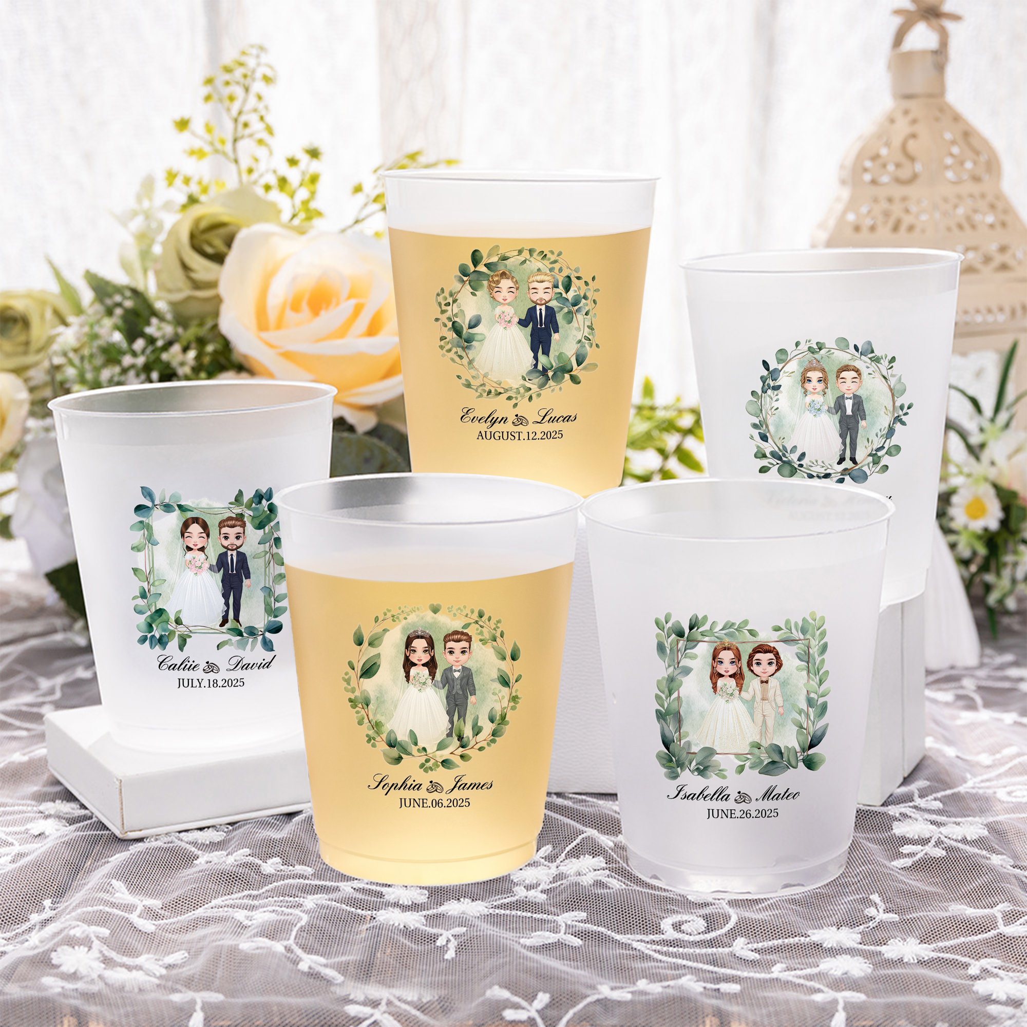 Gepersonaliseerde Cartoon Bruid en Bruidegom Krans Frosted Food-Grade Plastic Beker met Naam en Datum Set van 10 Huwelijksverjaardag Cadeau voor Pasgetrouwden