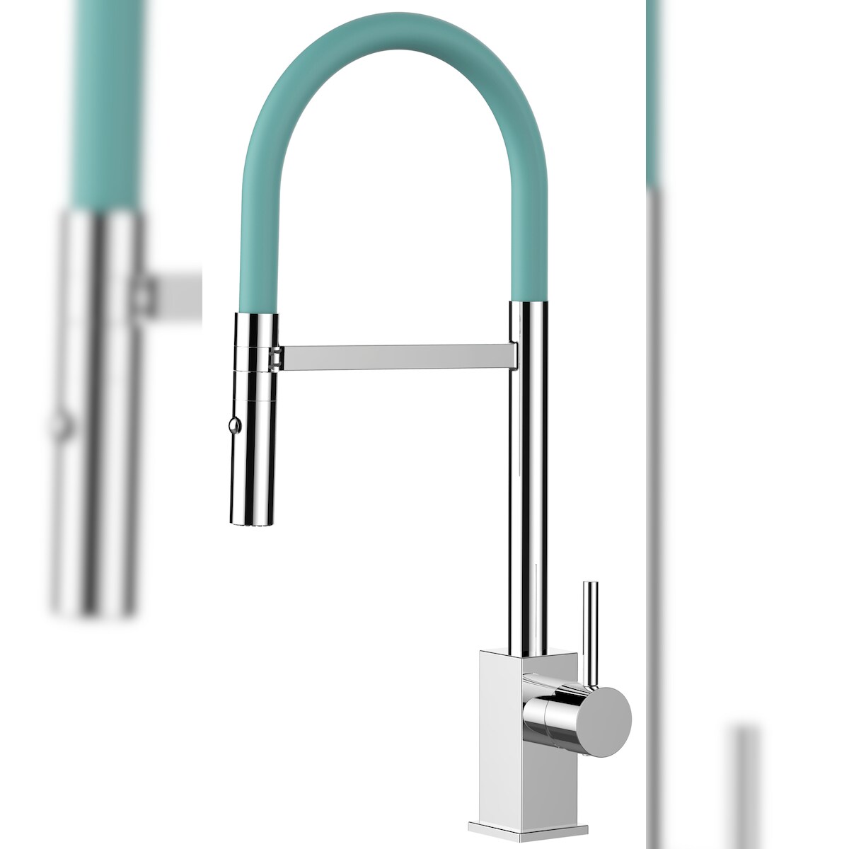 Vizio Wasserhahn Küchenarmatur Spültischmischer, Verchromt mit 360° schwenkbarem Türkis Auslauf, abnehmbare 2 strahl Handbrause, Quadratisches Design