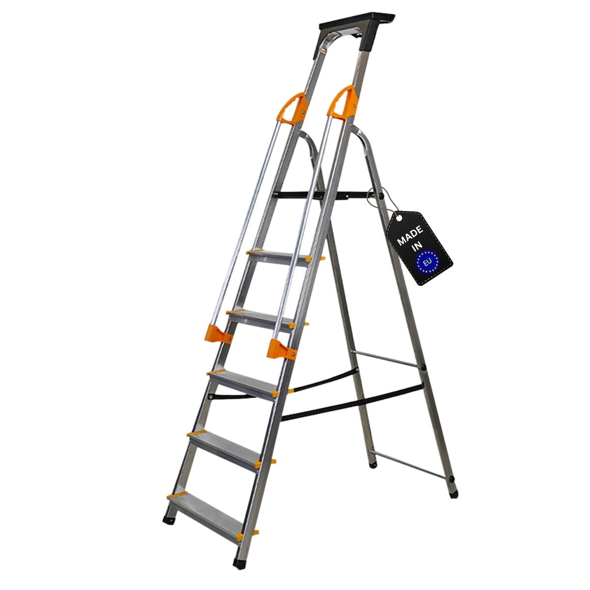 PROREGAL Stufenstehleiter ATLAS mit Werkzeugablage & Handlauf | einseitig begehbar | 6 Stufen | Arbeitshöhe 3,19m | Traglast 150kg