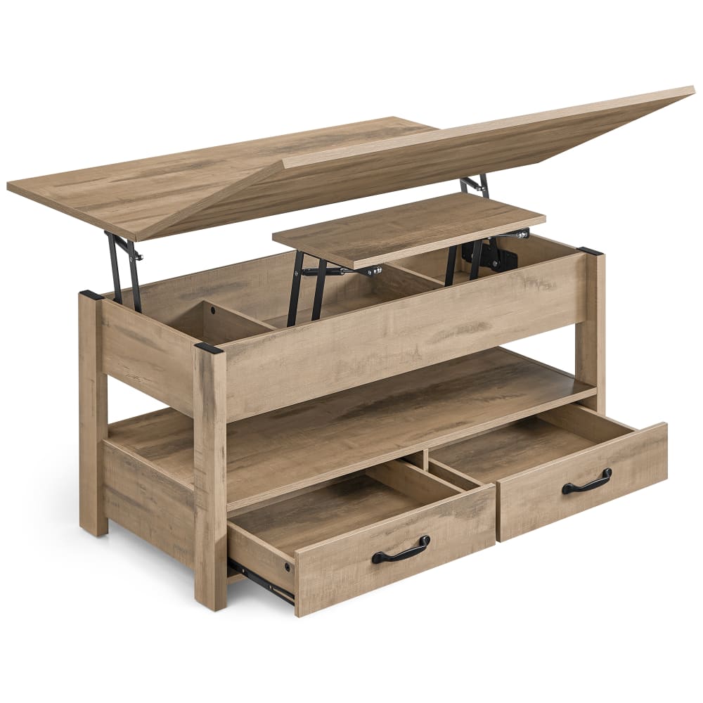 Table basse relevable vérin à gaz 2 tiroirs et 3 compartiments marron