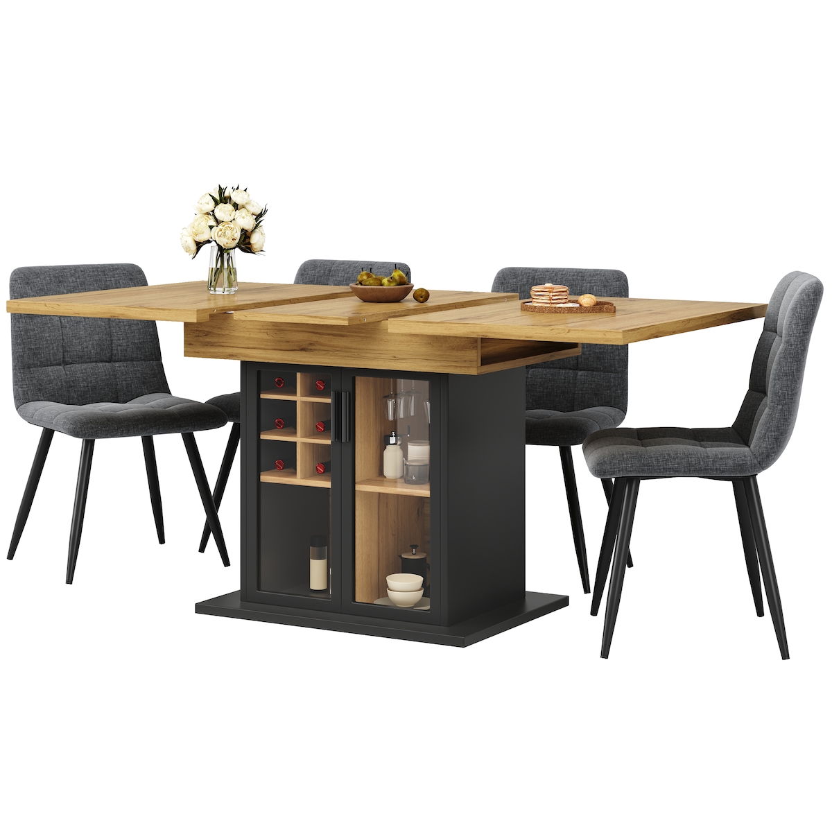 STILVORA Ausziehbarer Esstisch 140x80x76 Schwarz mit Weinregal Einsatz und gehärteter Glastür, MDF Tischplatte kratzfest, Soft Close, platzsparend