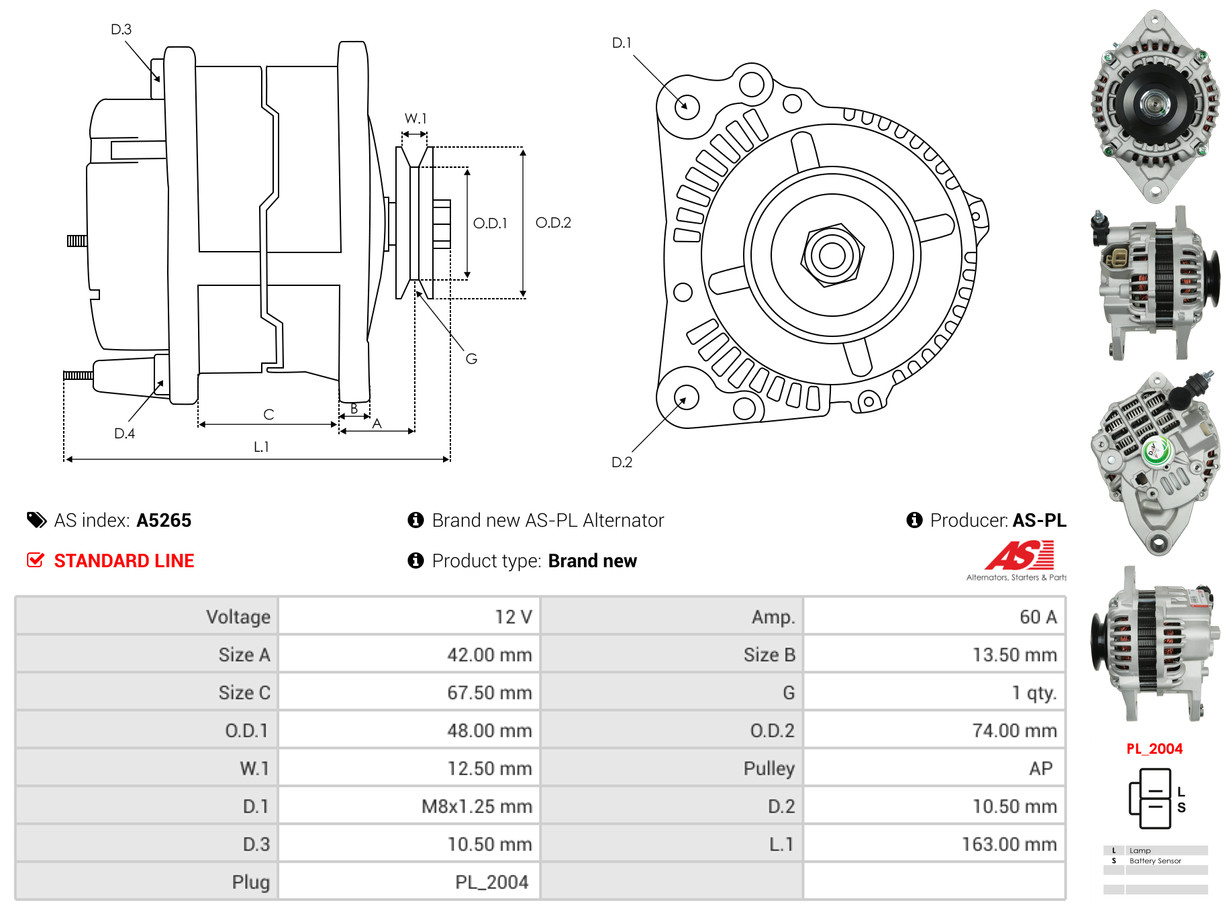AS-PL Generator A5265 12V 60A für MITSUBISHI MAZDA B64J-18-300 A005T03677 A002T35277