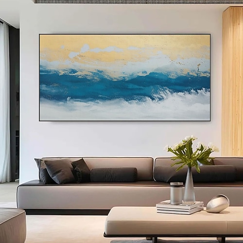 dipinto murale blu extra large su tela, dipinto tramonto sull'oceano, dipinto murale dorato, arte astratta blu, tela con texture, arte murale sulla spiaggia