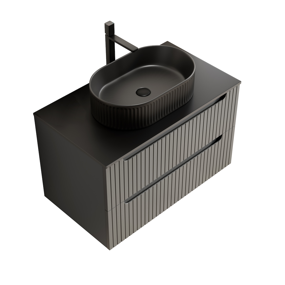 MODFU Badezimmer-Waschtisch 62×80×46 cm mit ovalem Waschbecken aus Keramik und Sintersteinplatte in Dunkelgrau+Schwarz