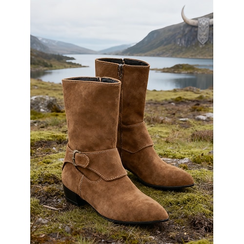 stivaletti da donna in pelle scamosciata marrone vintage di ispirazione medievale con dettaglio fibbia, perfetti per abbigliamento casual e all'aperto, autunno e inverno