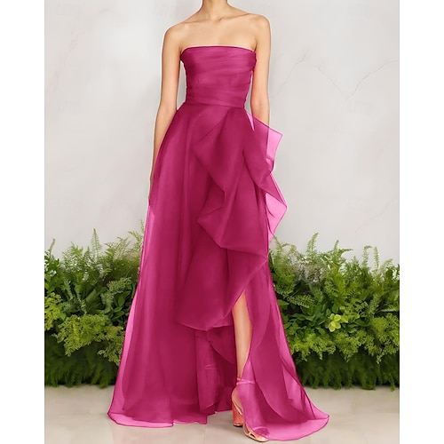 Abito da Sera A-Line Stile Celebrità Abito Elegante Ospite di Matrimonio Lunghezza Pavimento Senza Maniche Spallina Unica Organza con Rouches Arricciate Fessura