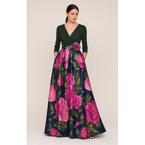 Abito da Cocktail A-Line Floreale Elegante Abito Matrimonio Formale Lunghezza alla Caviglia Manica Mezza Collo a V Abito Crepe Elasticizzato con Ricamo Tasca