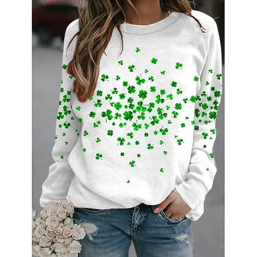 Felpa con cappuccio portafortuna per San Patrizio da donna, motivo floreale, grafica trifoglio, casual, manica lunga, girocollo, regular, casual, street, nero, bianco, verde chiaro, primavera,