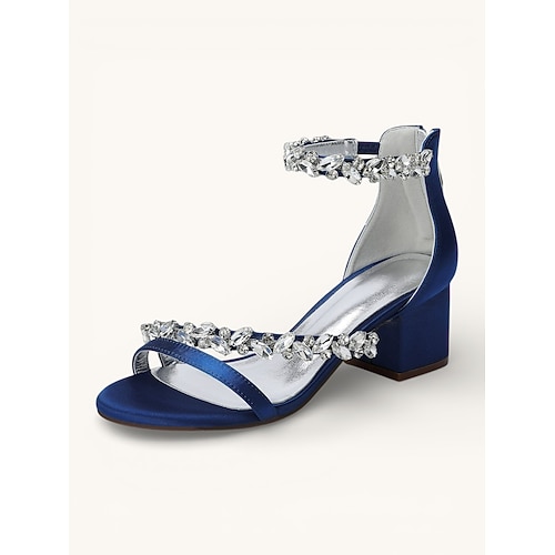 sandali da donna con tacco a blocco in raso blu - scarpe da sera decorate con strass e cinturino alla caviglia per banchetti formali e cocktail party
