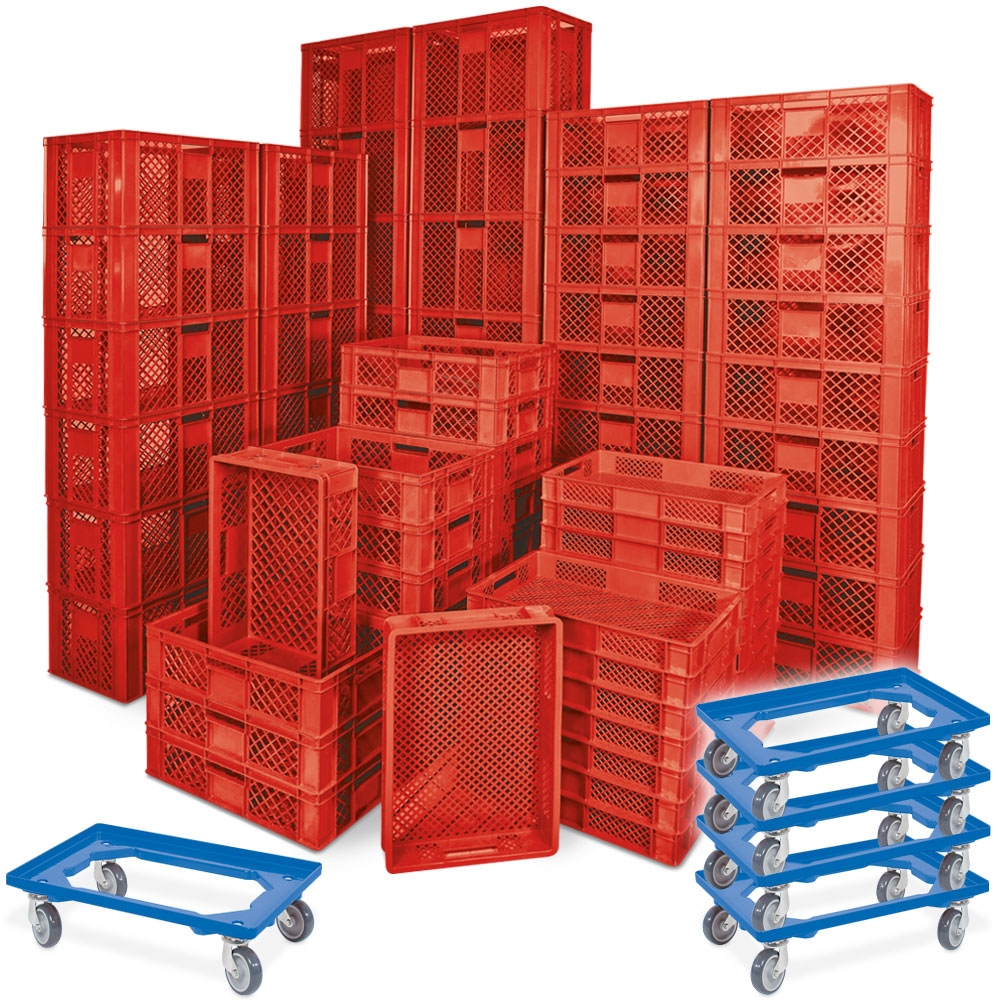 BRB 78 Stück Stapelkörbe/Bäckerkästen in 5 Größen, Grundmaß LxB 600 x 400 mm, H 90 mm, 150 mm, 240 mm, 320 mm, 410 mm, Farbe rot, blau