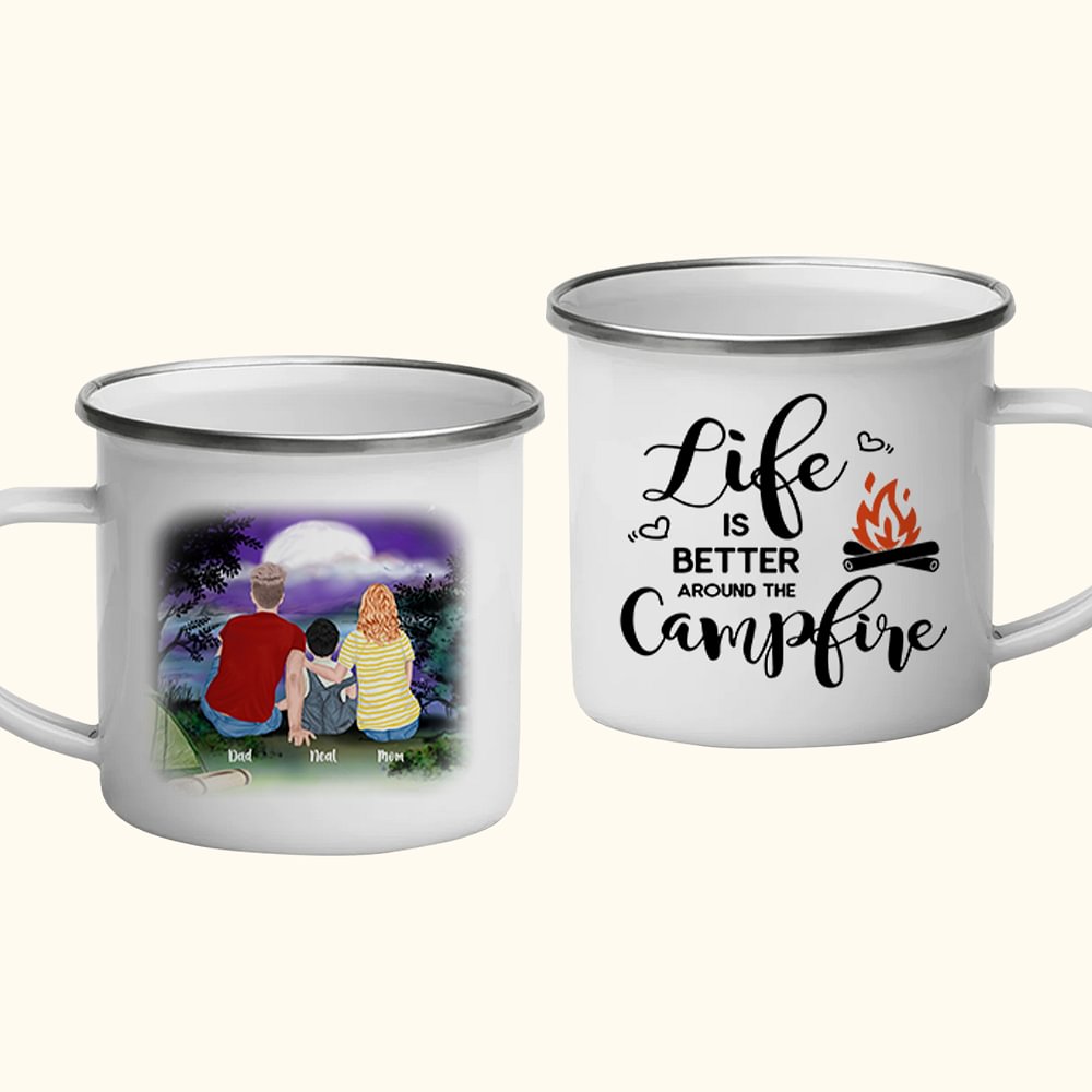 Taza esmaltada personalizada Life Is Better Around The Campfire Night Camping Family Couple with Kid Regalo de aniversario