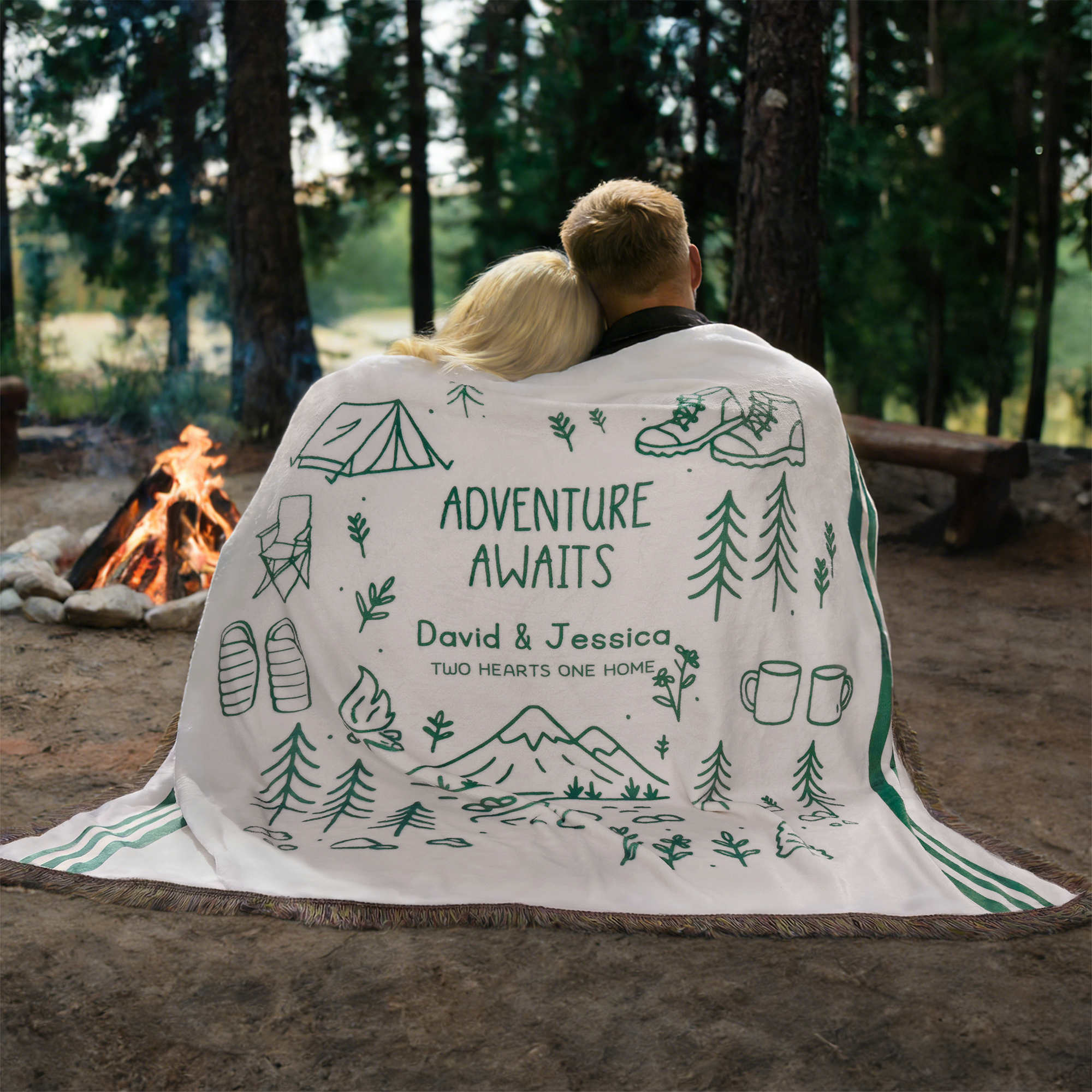 Plaid personnalisé avec texte (Line Art Style Moss Green Percy Stripes Adventure Awaits Tassel) Cadeau d'anniversaire et de camping pour les amoureux de la nature