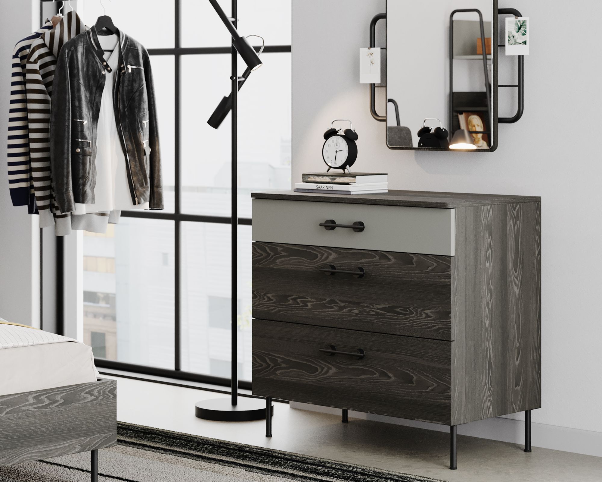 Petra Kommode 4 Schubladen Eiche Struktur Dekor und weiss Hochglanz.