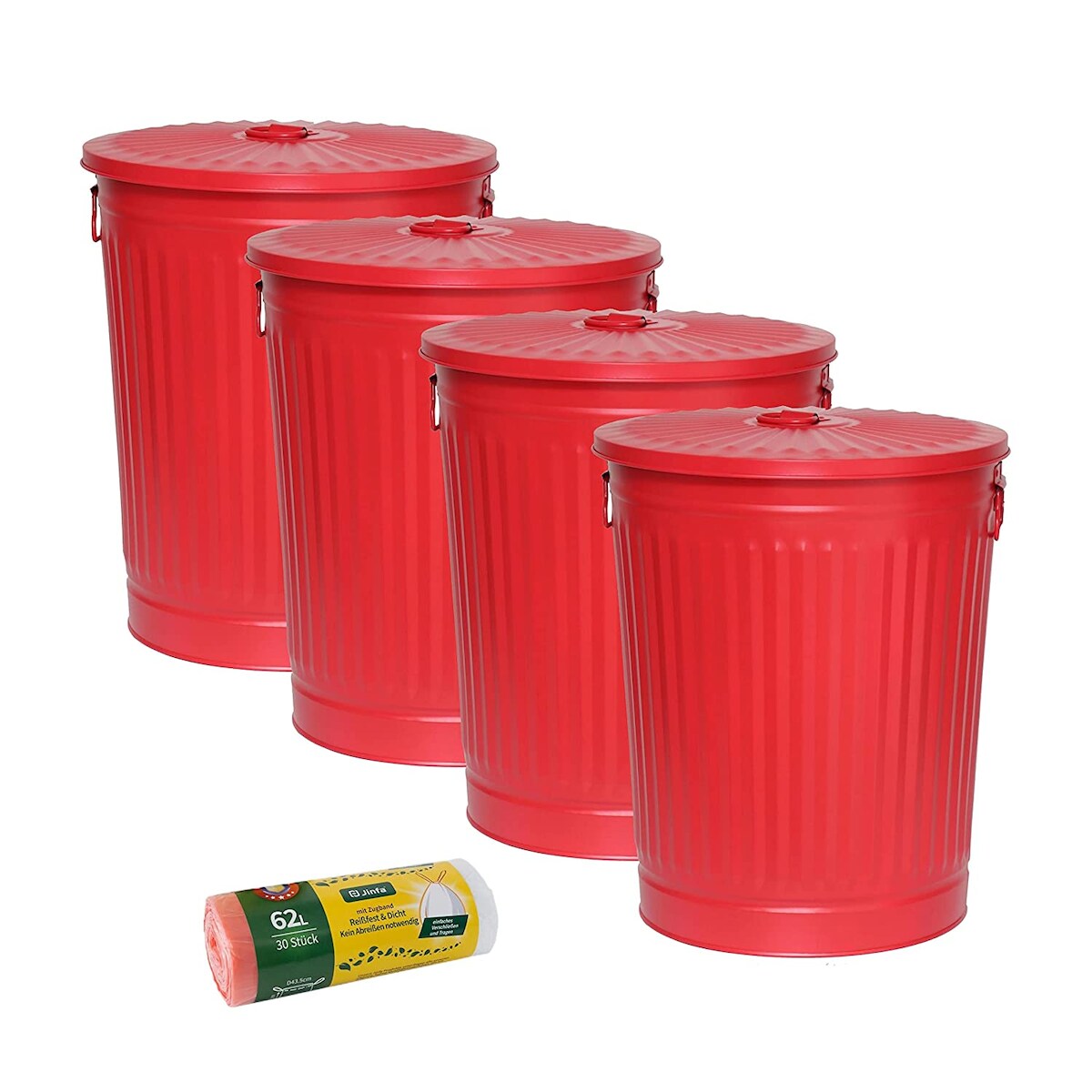 H&D Manufaktur Jinfa 4er-Set Retrodesign Mülleimer mit Griffen und Deckel + 30 Müllbeutel | Rot | 62L