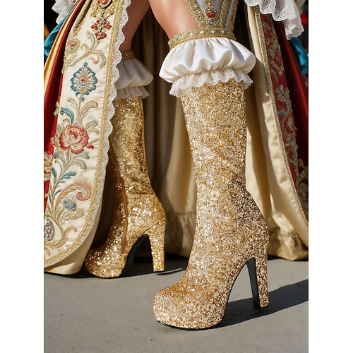 stivali da donna con plateau e glitter argento - calzature da carnevale con tacco spesso fino al ginocchio per feste in maschera veneziane, balli in maschera abiti da festa