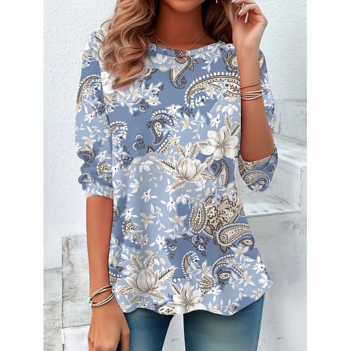Per donna Blusa Floreale Grafico Paisley Vintage Tropicale Elegante Manica Lunga Girocollo Top Regolari Quotidiano Stampato Blu turchese Primavera Autunno Inverno