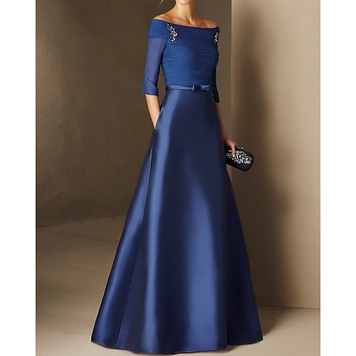 A-Line Abito da Sera Elegante Abito Formale Matrimonio Lunghissimo Manica Corta Off Shoulder Abito per Madre della Sposa in Satin con Tasca Glitter