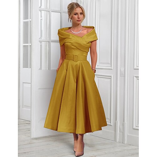 Abiti da Cocktail A-Line Abito Elegante Abito Formale Matrimonio Lunghezza Tea Lunghezza Midi Senza Maniche Copertura Regolabile Bottoni Scollo Off Spalla Satin con Plissettature