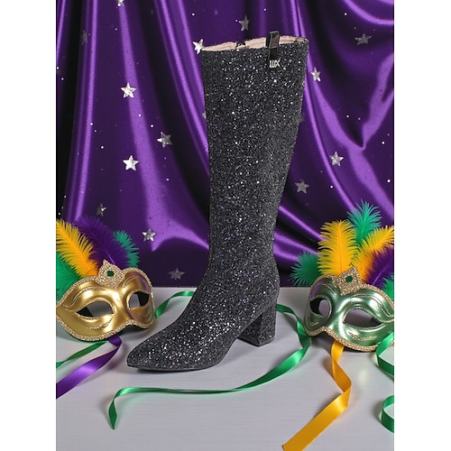 stivali alti fino al ginocchio con glitter rosa da donna e tacchi a blocco: un capo alla moda scintillante e audace, perfetto per carnevale, festival e feste in maschera