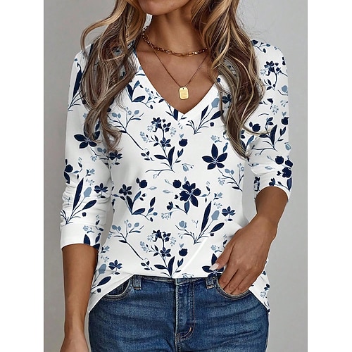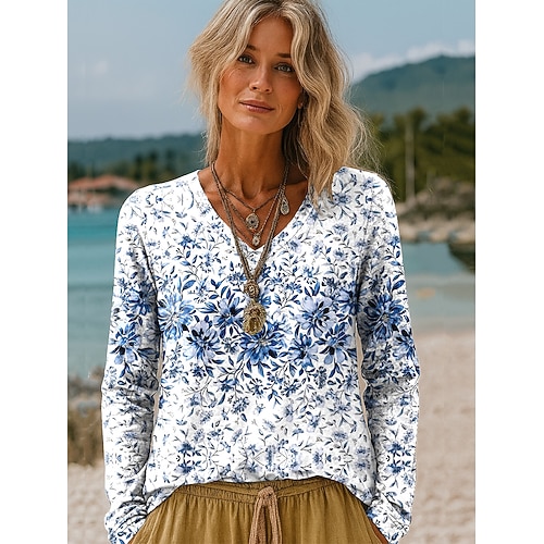 Per donna Maglietta Floreale Grafico Piante Vintage Elegante Classico Manica Lunga Scollo a V Top Regolari Quotidiano Stampato Blu Arancione Marrone Cachi Primavera Autunno Inverno