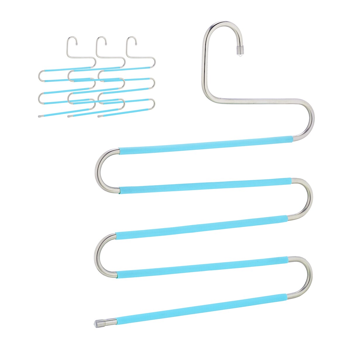 Relaxdays Mehrfach Hosenbügel, 4er Set, S-Form, 5 Stangen, rutschfest, platzsparende Multibügel, Metall, silber/hellblau