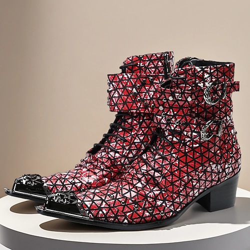 stivaletti punk da uomo in vera pelle rossa con motivo geometrico e cinturini con doppia fibbia, stivali in stile western in pelle bovina al 100% per la moda da palcoscenico e da discoteca