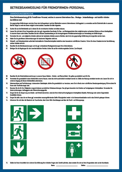 Aushang, Betriebsanweisung für Fremdfirmen Personal - ISO 7010 Piktogramme - 297x420x1.5 mm Kunststoff
