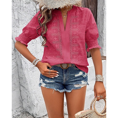Per donna Blusa Semplice Elegante Casual Mezza Manica Scollo a V Top Regolari Quotidiano Ferie Uscire Traforato Blu Bianco Verde chiaro Rosa Estate Primavera Autunno