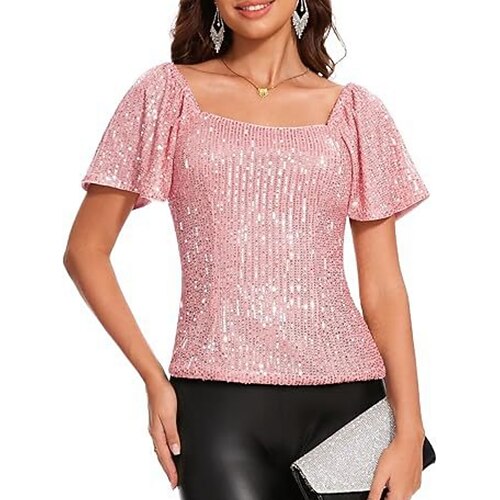 Per donna Blusa Tinta unica Elegante Casual Manica Corta Collo quadrato Top Regolari Ferie Glitter Rosa cipria Rosa Rosso Blu marino Albicocca Estate Primavera