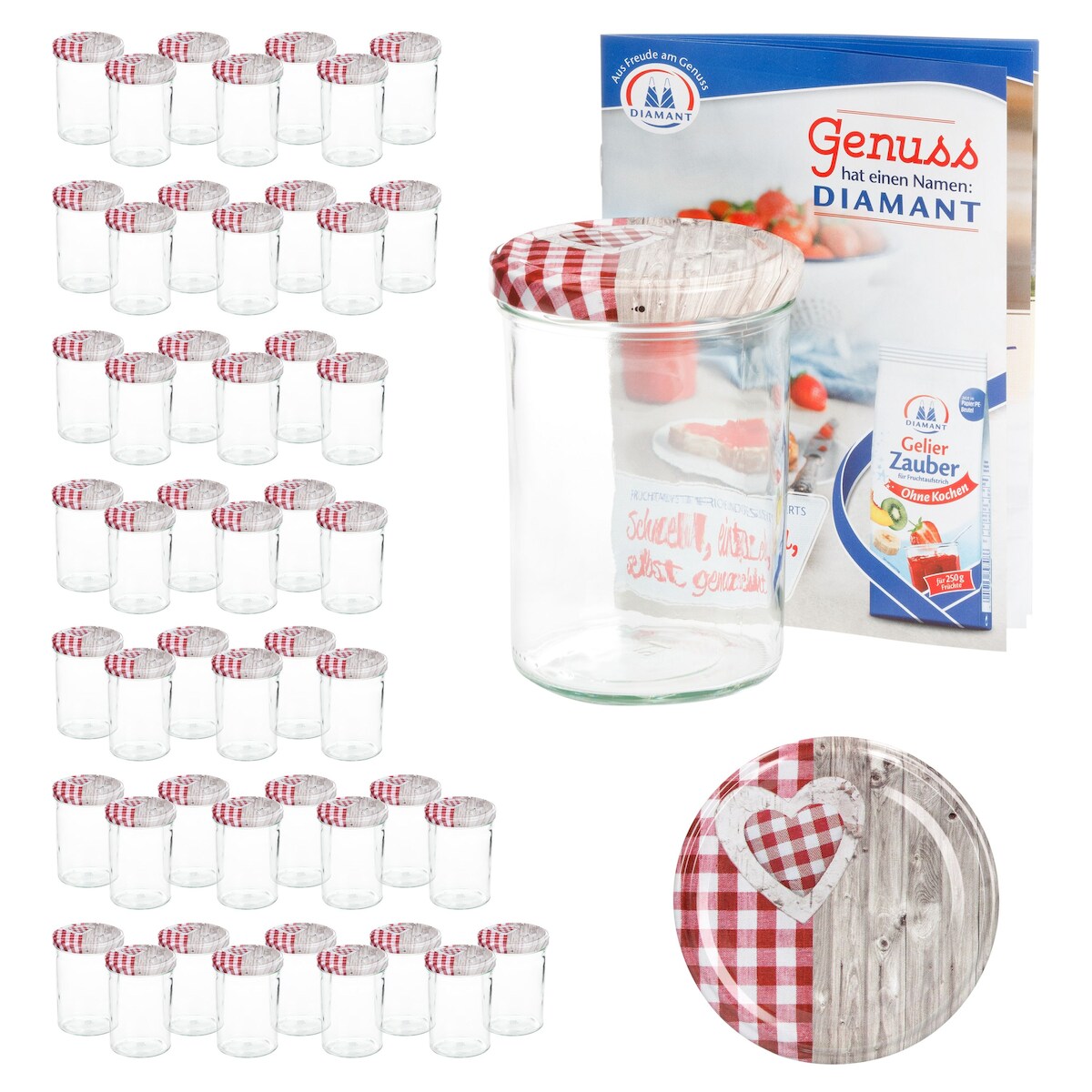50er Set Sturzglas 435 ml To 82 Deckel Holz Herz rot incl. Diamant Gelierzauber Rezeptheft