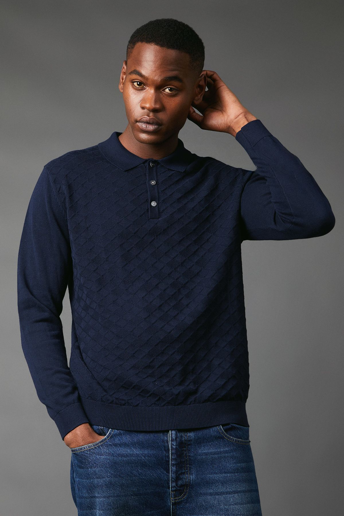 Maine Mens Navy Textured Long Sleeve Knitted Polo Cotton - Size Large | Maine Sale | Discount Designer Brands