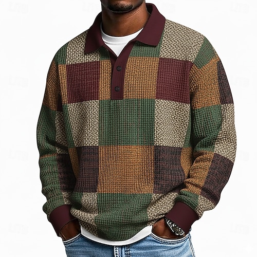 Per uomo Plaid Blocco di colori Magliette Polo a Nido d'Ape Manica Lunga Magliette polo Bavero Abbigliamento Sportivo Casual Scuola Athleisure Abbigliamento quotidiano Stampa 3D Primavera Autunno