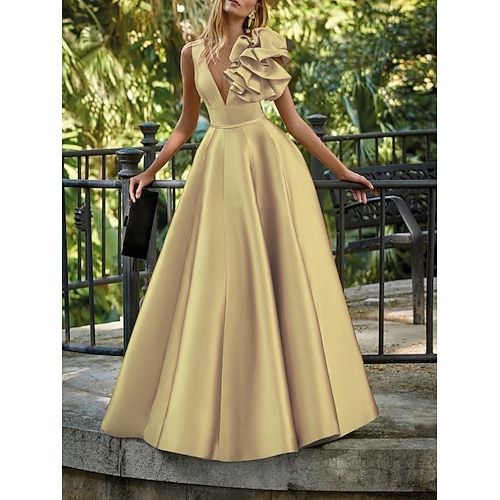 Matrimonio in Spiaggia Abito da Sera A-Line Oro Abito Elegante Ospite di Matrimonio Lunghezza Piena Senza Maniche Collo a V Raso con Fiore sulla Spalla