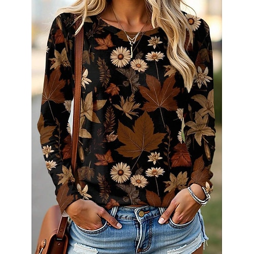 Per donna Maglietta Floreale Grafico Piante Moda Elegante Classico Manica Lunga Girocollo Top Regolari Quotidiano Weekend Stampato Marrone Estate Primavera Autunno