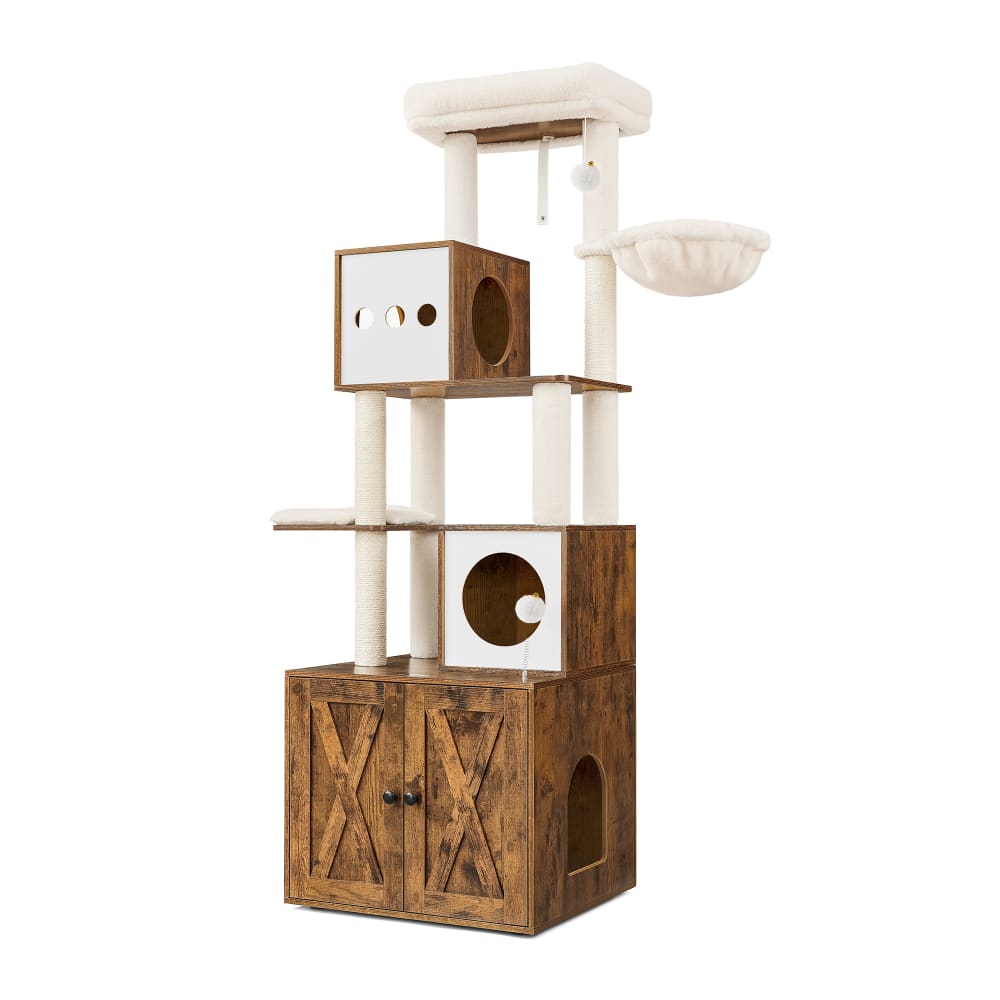 Arbre à chat hauteur 180 cm avec cache-litière tapis lavables marron