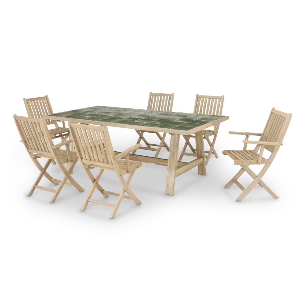 Set tavolo in legno e ceramica verde 205x105 + 6 poltrone