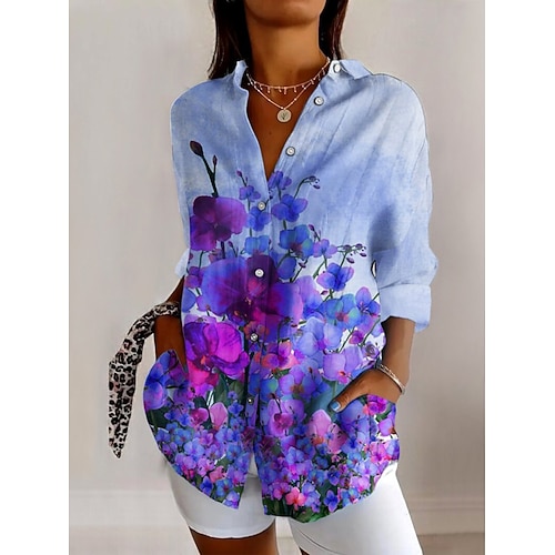 Per donna Camicia Bottoni Stampato Floreale Elegante Quotidiano Moderno Manica Lunga Colletto a Camicia Top Regolari Quotidiano Ferie Blu Rosso Primavera Autunno