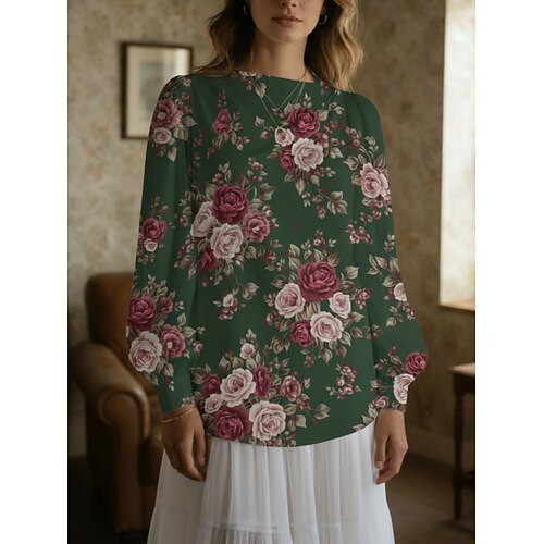 Per donna Camicia Stampato Floreale Foglia Vintage Elegante Casual Manica Lunga Colletto a Camicia Top lunghi Blu Rosa Verde Estate Primavera